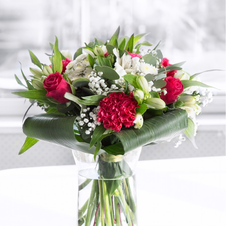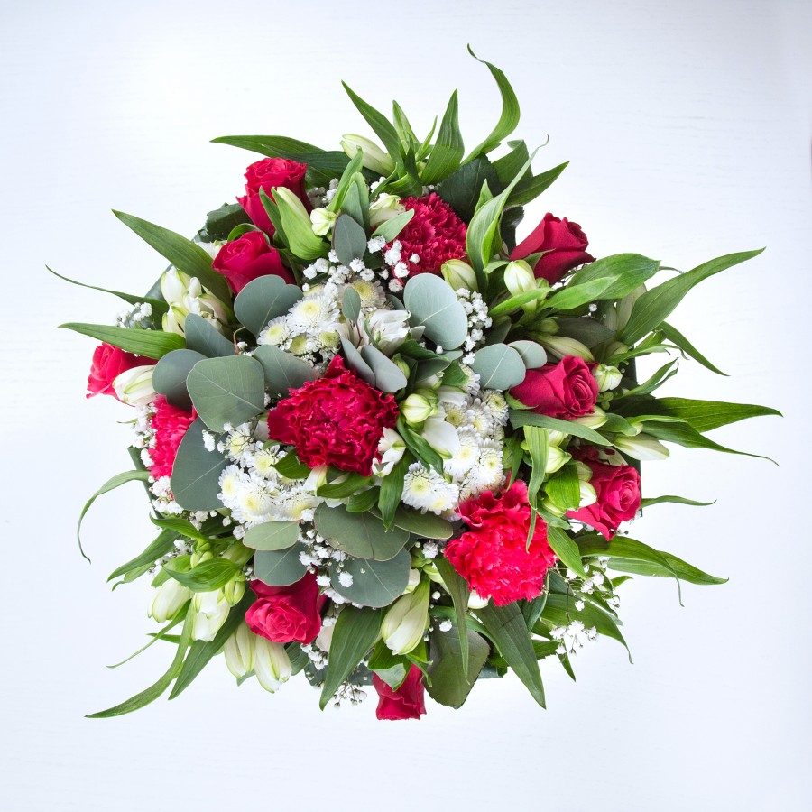 Our Luxurious Blossom Bouquet is a testament to exquisite design and unique beauty. It features a stunning arrangement of red roses, white chrysanthemums, and gypsophila, perfectly complemented by carnations and lush green foliage.