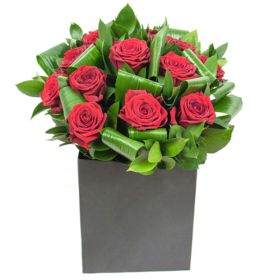 Introducing our stunning floral masterpiece that effortlessly combines timeless elegance with modern design. Featuring radiant red roses alongside flourishing aspidistra leaves and delicate ruscus, each flower is carefully hand-selected to deliver lasting beauty and freshness.